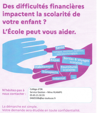 Par Catherine Gey, publié le mercredi 15 octobre 2025 07:59 - Mis à jour le mercredi 15 octobre 2025 07:59Si vous êtes en difficulté financière pour la scolarité de votre enfant, n'hésitez pas à prendre contact avec le collège -