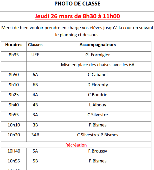 Veuillez trouver le planning pour les photos de classe qui se dérouleront jeudi matin.